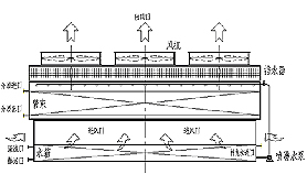 该工艺流程如图所示,工艺介质通过蒸发冷却器把热量传给管束外的水膜,水膜迅速蒸发带走热量,蒸发后的湿空气由上方的风机抽走,并由下面再进来新的冷空气,如此循环。
