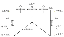 该工艺流程如图所示,工艺介质通过空气冷却器管束把热量传给翅片管外的空气,热空气通过上方的风机抽走,再从侧面进入新的冷空气进行循环。