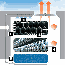 技术 混流闭式冷却塔结合使用机械、抽风式横流技术以及位于盘管上/下方的填料。 工艺